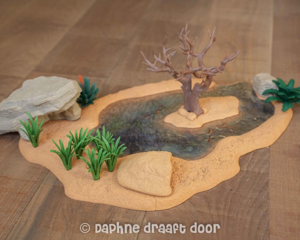 Tweedehands waterplaats/waterbron van Schleich, in de collectie geweest tussen 2015 en 2018. Zeer gedetailleerde set met planten en stenen (die ook verplaatst kunnen worden) en boom die gebogen kan worden (zie foto’s). Een paar plantjes ontbreken.