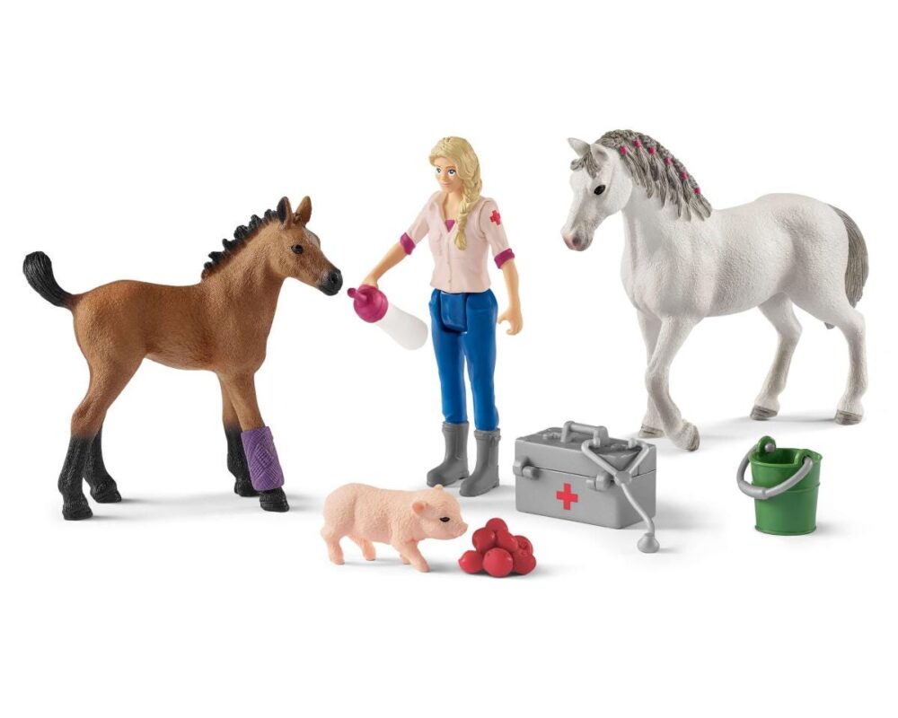 Breng de dierenarts naar jouw Schleich manege! Deze set bevat een paard, veulen, biggetje, dierenarts en bijpassende accessoires.