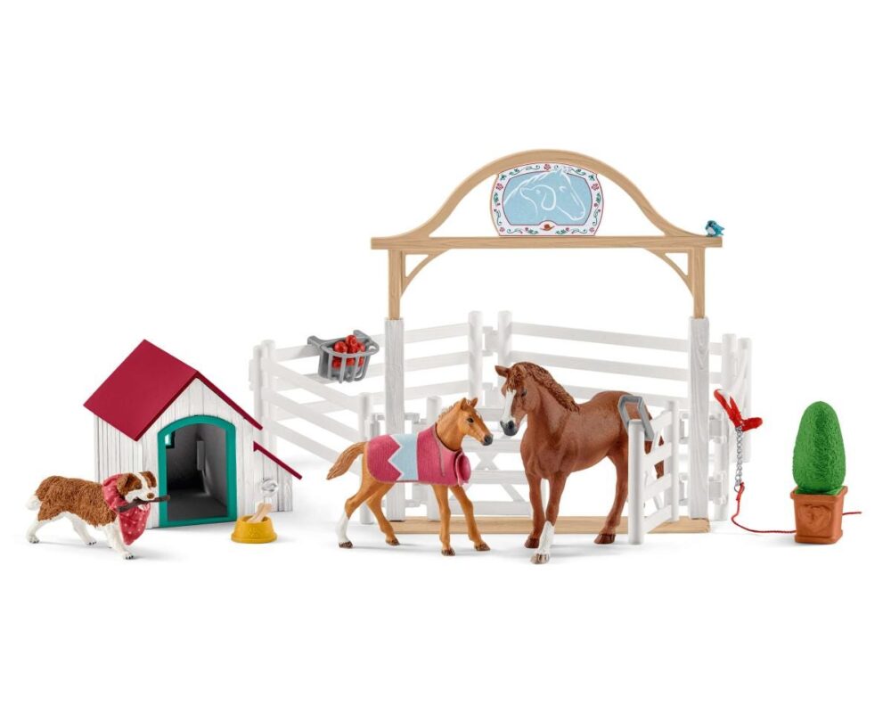 Deze leuke set bevat een paddock met toegangspoort, twee Schleich paarden, een hond en hondenhok. De perfecte aanvulling voor jouw Schleich manege.
