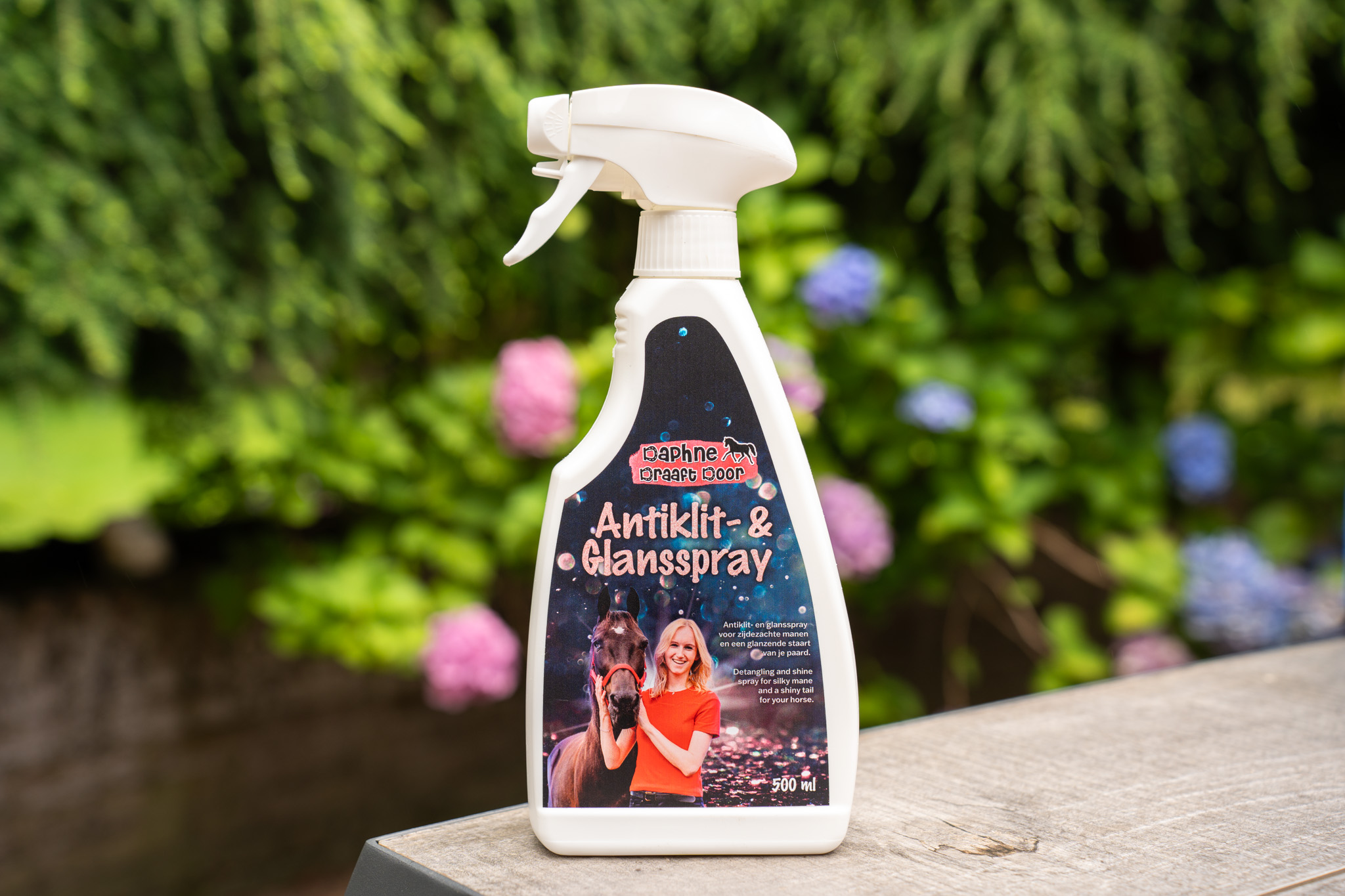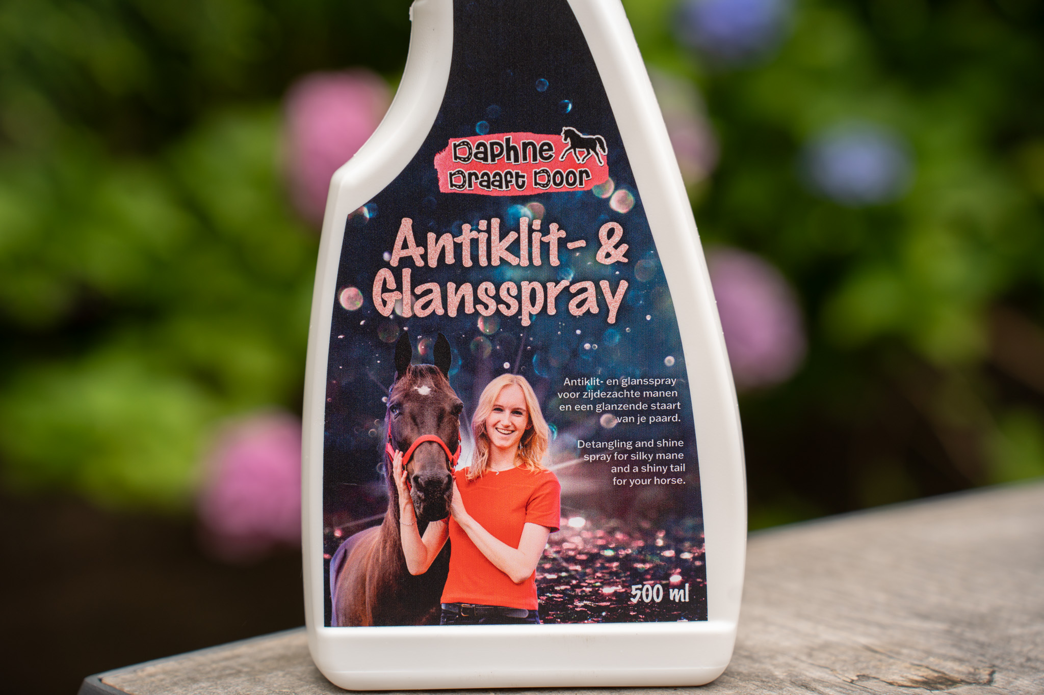 De Daphne draaft door Antiklit- en Glansspray is dé verzorgingsspray voor de manen en staart van je paard. Dankzij de spray worden de manen en staart van je paard super zacht, met een prachtige glans én zonder klitten! De Antiklit- en Glansspray is onmisbaar in je poetstas.