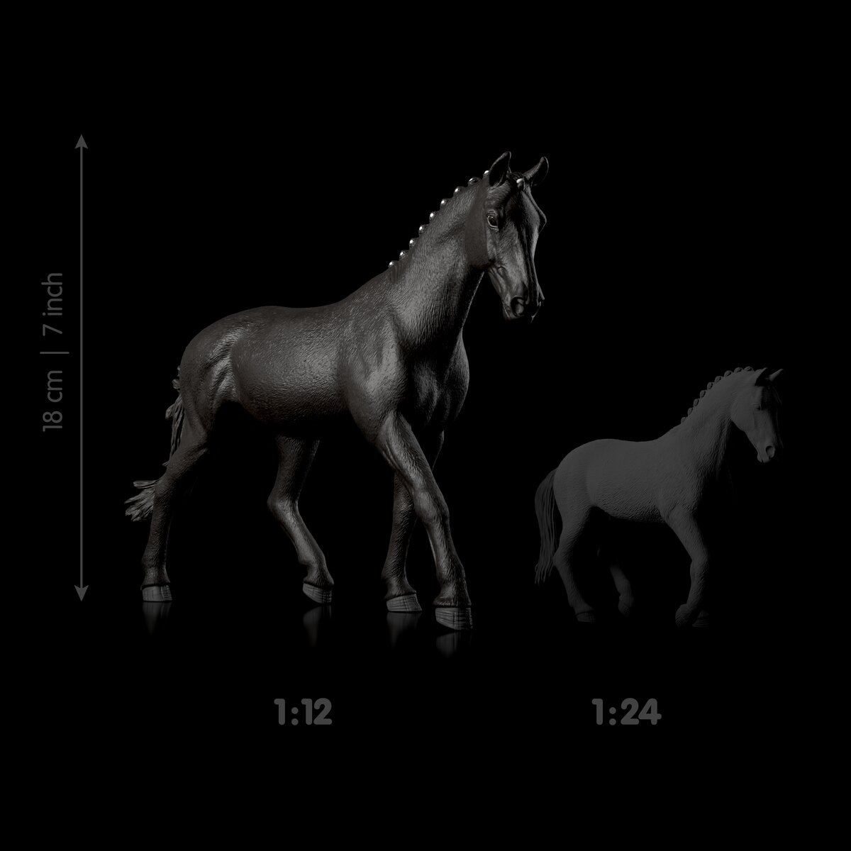 De elegante Trakehner merrie draaft sierlijk. De elegante beweiging en trotse houding van dit figuur komen bijzonder goed tot hun recht op een schaal van 1:12. Dit paardenras is goed in dressuur en springen. Dit figuur legt de essentie van de Trakehner tot in elk detail vast: de aandachtig gespitste oren en de zacht gebogen nek stralen temperament uit. De manen zijn bijzonder mooi, gevlochten in knotjes en versierd met witte details. De Trakhner is een levensecht model perfect voor verzamelaars.